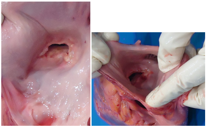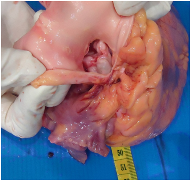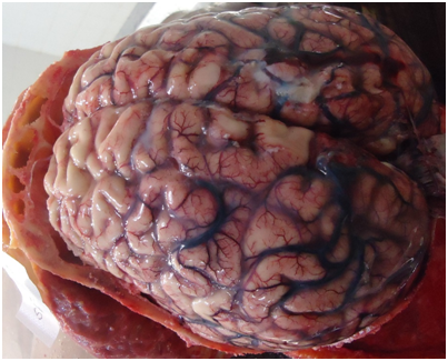 From the 20th week of POA onwards, her fatigability and shortness of breath gradually worsened until it warranted her to be admitted to the same ward in the same tertiary care hospital during the latter part of the 27th week of POA in a state of severe restlessness, dyspnoea and mild fever. On admission she was in heart failure possibly due to rheumatic valvular heart disease. Abdominal ultrasound scan confirmed Intra Uterine Death (IUD). An emergency hysterotomy was performed. She developed fever and died the next day following multi-organ failure. An inquest was requested and a judicial post-mortem examination was performed by the consultant judicial medical officer. The autopsy revealed classical and full range of rheumatic valvular heart disease which is a rarity today. Figures 1–4 respectively show the valvular changes, severely congested lungs with macroscopic features of ARDS and congested brain. Her death was an indirect maternal death. Haemodynamic challenges of an advancing pregnancy would have pushed her to the verge of cardiac failure. Otherwise her rheumatic valvular changes would not have caused her death at this age.