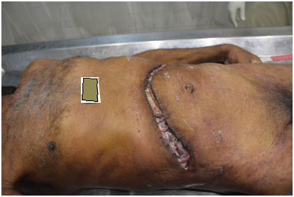 A retired male school teacher of 69years of age had been apparently healthy until he developed severe abdominal pain as the first symptom. He sought treatment from a consultant physician. In the second visit a CT scan of the abdomen was done revealing a distal cholangiocarcinoma. For patients with the above condition, had the diagnosis been made early enough, pancreaticoduodenectomy (also called Whipple procedure) remains the best surgical option. Within a period of around three months of the diagnosis, Whipple surgery was performed on the patient in a specialized surgical unit in a tertiary care hospital in government sector. The operation was uneventful and he was discharged on the eighth day post-op. All necessary advice regarding postoperative care was given and he was referred to the surgical clinic to be seen at once-a-week intervals initially. He was well until two weeks after the surgery. Wound toileting was done every other day. At the end of the second week his wound on the surgical site appeared to be infected. He was admitted to the same surgical unit where debridement of the skin wound alone had been performed by a junior doctor. No ultrasound or any other form of imaging of the abdomen was performed. His abdomen was not examined by a consultant surgeon with a view of excluding any possibility of internal communication of the apparent cutaneous wound. He was discharged the same day. At home his general condition started to deteriorate further. The cutaneous surgical wound gradually got worsened despite strict adherence to instructions given by the ward upon discharge following wound debridement. More and more fowl-smelling purulent discharge was oozing from the wound. He developed high spiky fever with chills and rigors. His urine output was reduced and consciousness was frequently clouded. This deterioration took place rapidly within three days where he was re-admitted to the same unit on the eighteenth day post-op in a state of unconsciousness. The GCS was 3/15 and the blood pressure was unrecordable. The non-contrast CT brain was unremarkable. Haematological and biochemical investigations were in favour of sepsis with metabolic acidosis. The next day (day 20 post-op) he was pronounced dead. As the senior next of kin of the deceased had raised several medico-legal issues including the source of sepsis and its contribution to surgical procedure and the death being one with a potential for subsequent allegation of medical malpractice, an inquest into the death was requested to be followed by a judicial autopsy. At autopsy, the body was that of a thin built male with no external features of dehydration or emaciation. Mild icterus was noted. The sub-costal Kocher incision measured 28cmX2cm with necrotizing margins with visible underlying muscle. With the involvement of the distant organs in the form of peritonitis and meningitis etc. (discussed later), the surgical site infection could easily and safely be classified as “organ or space Surgical Site Infection (SSI)” (Figure 1).5