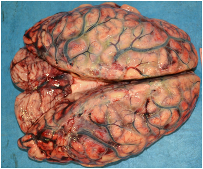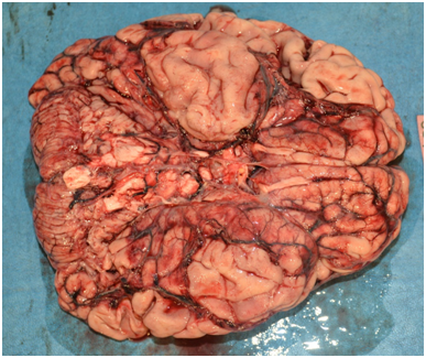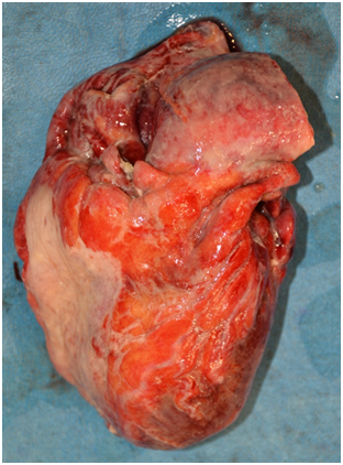 Routine dissection of all organs was done during internal examination. The brain weighed 1400g. It was dusky red in colour with marked congestion and features of meningitis. Cut sections revealed areas of necrosis with clear demarcation of grey and white matter (Figure 2). His neck structures were unremarkable. The lungs were congested and beefy red in colour, the right lung weighing 360g and the left lung 350g. No features of pulmonary embolism were evident to the naked eye. The pleural cavities contained blood-stained serous fluid, 160 ml and 200ml respectively on the left and the right sides. The pericardium contained 75ml of purulent fluid with dense adhesions to the outer surface of the heart (Figure 3). The heart weighed 360g. Major coronary arteries and their principal branches were not calcified and the maximum atherosclerotic narrowing was 30%. The heart valves appeared unremarkable.