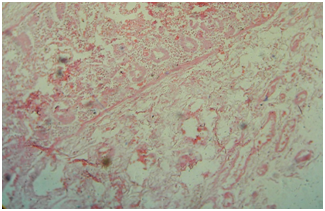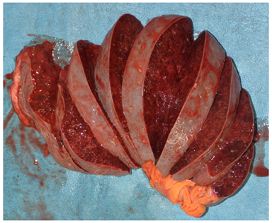 The endocardium appeared normal and the myocardium was flabby and pale. The epicardium was covered with yellowish, shaggy fibrous exudate. The undersurface of the diaphragm overlying the surface of the liver too was covered with a thick layer of frank pus. The peritoneal cavity contained approximately 350ml of sero-purulent fluid with offensive smell. Approximately a half of the left lobe of the liver was surgically resected. Pancreaticojejunal, hepaticojejunal, gastrojejunal and jejunojejunal anastomosing sites were free of features suggestive of leakage. A thin yellow purulent exudate was seen over entire peritoneal surfaces. Remaining segments of the small intestinal serosa was congested and flakes of pus were seen adhered onto the surface. No internal hemorrhages were noticed. The large intestinal serosa was also congested and was covered with a thick layer of pus. Both kidneys were normal in size and shape but pale in colour with no visible cortico-medullary demarcation. The bladder contained small amount of cloudy urine with an offensive smell. The bladder mucosa was not shiny and was covered with a thin layer of pus. The mucosa of the ureters too had the same appearance. The remaining portion of the pancreas did not show any overt macroscopic features of acute or chronic pancreatitis. The spleen was enlarged, soft and flabby with a thin layer of pus on the outer surface. It weighed 230g (Figure 4). The histopathology confirmed the gross changes seen and some micrographs are shown here Figures 5 A‒D.