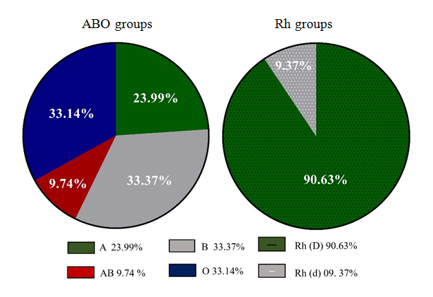 Besides, blood groups are thought to be associated with different disorders such as salivary gland tumors, carcinoma, stomach carcinoma, thyroid disorders, small cell lung cancer, and cardiovascular disease.11–14 The types of blood groups are hereditary. ABO blood groups are regulated by a single gene having three alleles found on chromosome 9. Rh blood group system inheritance is dependent on the existence of either R or r alleles. All human species have the same blood grouping system, with significant variations between frequencies' different incidence. The prevalence and frequency distribution of these blood groups among various cultures and races need to be understood. The occurrence of ABO and Rh blood groups among the Pakistani population indicates a marked variance, suggesting racial variations, ethnic as well as genetic differences of the Pakistani community.15–24