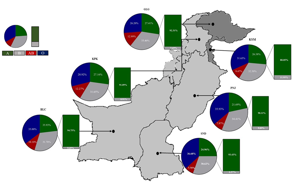 Figure 2 Map showing the frequency (%) of ABO and Rhesus blood groups in differentregions/provinces of Pakistan. Pie chats represent per state average proportions of ABO; and bars show the proportion of Rh (D) groups. GLG = Gilgit; KSM = Kashmir; KPK = Khyber Pakhtunkhwa; PNJ = Punjab; SND = Sindh; BLC = Balochistan.