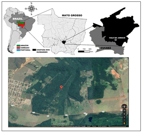 Mato Grosso, central region of Brazil, is the third largest state in the country and covers three biomes: The Amazon (rain forest), Cerrado (Brazilian savannah) and Pantanal (tropical wetland). The study was conducted in the locality of Jamacá in the city of Chapada dos Guimarães/Mato Grosso-Brazil, in a particular area located by the coordinates: GPS:L06-01-88-4/N82-77-22-8 (Figure 1).
