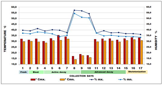 The decomposition rate can be different even in the same area or district, due to regional, environmental, topographical and geographical factors.13 Dias57 reported the skeletonization of a Sus scrofa carcass after 16days, in the city of Cuiabá, Mato Grosso. It was possible to observe that, for the studied region, active decay started on the fourth day after death, and advanced decay, after the ninth day. The dry remains phase was identified on the 15th day, when the final collection events took place up to the 17th day. Specimen collection was avoided around 10:00 a.m. due to the extreme heat and low winged insect activity, even in the presence of shade from the vegetation, where thermal sensation was 40ºC. Several authors have reported that biotic phenomena are affected by the environment (rain, heat, cold, humidity...)1,7,13 The temperature drop observed in the present study could have slowed down necrophagy and decomposition, which resumed as the temperature rose again on the next days. The rain may also have slowed down tissue dehydration, hampering the decomposition process. Temperature influences larvae activity on the carcass13,52,53 including that larval activity by itself may increase temperature through production of metabolic heat. The mentioned authors also report that high temperatures increase the number and type of insects associated with the cadaver and their activity accelerates decomposition.