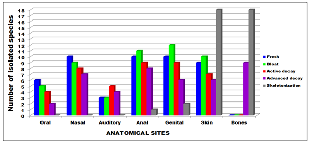 Rohlfs et al.,94 they recall that many resistant spore-releasing fungi release attractive secondary metabolites, allowing their ingestion by arthropods, thus becoming an efficient mean of dispersion by invertebrates. From the moment the vital signs cease, the cadaveric phenomena begin, where the microbiota initiates the phenomena of bodily disintegration. This situation is similar to clinical practice when comparing residual microbiota in healthy hosts. In that case, they may trigger physiological shifts: immunodeficiency, use of immunosuppressive drugs, cancer and infections, where a high isolation of microorganisms is expected due to immunologic weakness.95 In this sense, higher frequencies in the isolation of yeasts were observed in the fresh, emphysematous and colliquative periods, where this appearance may be linked to the decrease in the action of bacteria. Therefore, the fungal microbiota of the mucous membranes can perpetuate its growth, since many species constitute mucosae microbiota.46