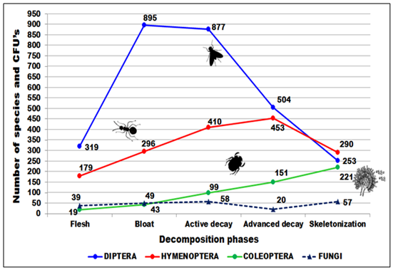 Figure 3 Flutuation of necrophagous insects (diptera, coleoptera and hymenoptera) and fungi collected during the decomposition stages in Vale do Jamacá, Chapada dos Guimarães, Mato Grosso, Brazil (2018).