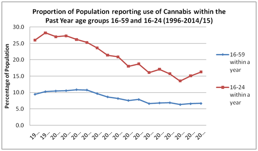 Figure 1 Self-reported use of Cannabis within the past between 1996- 2014/15.11