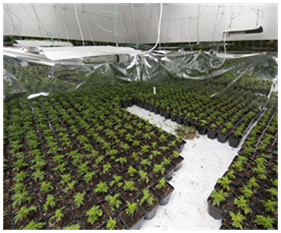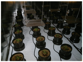 Most commonly, domestically cultivated cannabis is grown indoors within England and Wales according to a study carried out by Hough et al.15 The benefits to the grower are numerous; quality and quantity are easily controlled and it provides a secure location in which detection and theft are reduced considerably when compared to outdoor growing. Indoor growing does not necessarily mean a huge factory, where hundreds of plants are being cultivated to be sold commercially, but it also encompasses those who grow a couple of plants in a wardrobe for their own needs. Sometimes, especially in commercial scale grow operations, more than one room is utilised, a separate room for each stage of the cycle;5 growth stage and flowering stage. This separation is apparent due to different lighting requirements at each step of the plant cycle. The growth stage as mentioned in section 5.2 is where the plant grows in size, and typically 18-20 hours of light (artificial light discussed later) is used to encourage maximum growth.