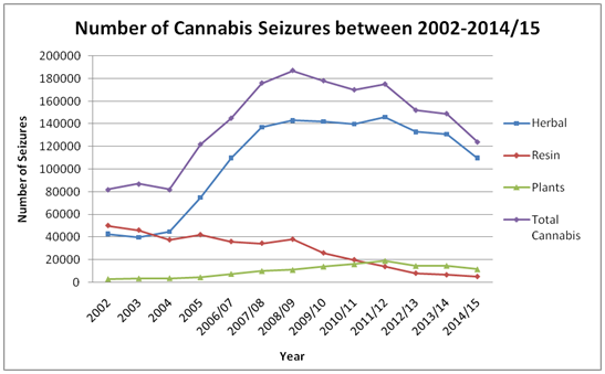 Figure 9 Number of cannabis seizures 2002-2014/15.39