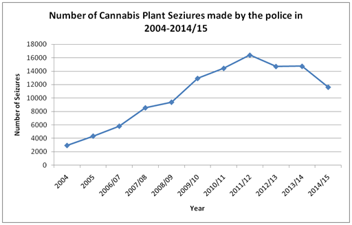 Cannabis has been known to grow outdoors within the UK but in much smaller numbers, the unreliability of the weather and the increased risk of detection are some of the factors deterring growers using natural conditions to grow cannabis. Seizure statistics provided by the Home Office in an annual report presented the number and quantity (Kg) of seizures performed by the police and UKBA for cannabis plants, herbal cannabis and cannabis resin. Under observation it was revealed that the number of herbal cannabis seizures had increased unprecedentedly between the years 2004 to 2011/12; meanwhile the number of cannabis resin seizures had been falling, which was once seized at a much higher rate.10 Post 2011/12 the number of herbal seizures declined significantly to 108,571 in 2014/15. These figures are somewhat skewed with police priorities and targets affecting them considerably.41 The unprecedented incline to 2011/12 can be justified by the introduction of the cannabis warning in 2004,40 but the most recent decline can be explained by national police budgets. This limited the resources available to proactively discover cannabis farms and prosecute those in possession of cannabis.45 Figures also gave evidence that cannabis plants have been more frequently encountered by the police in quantity and number of seizures than in 2004.