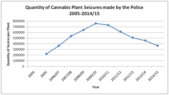 The number of resin seizures can be seen to be making a gradual decline throughout this time span, evidence of a changing market. Within this section, figures regarding the quantity of plants, herbal and resin seizures will be given from 2005 onwards due to the Home Office11,39 reporting data from earlier years not being comparable. The series of reports by the Home Office are published yearly, and provide statistics regarding Class A, B and C drugs. The number of seizures made by the police can escalate or decline depending upon the priorities, targets and police powers at that time; such as the introduction of cannabis warnings in 2004.40,41 More recently, police budgets could be the cause of decreased seizures of both herbal cannabis and plants, discussed further in sections 5.5.1 and 5.5.2. Taking into account these factors, caution must be taken as to not mistake the number of drug seizures as the prevalence of drugs in England and Wales.10