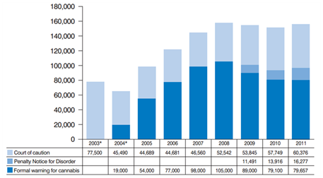 Figure 16 Number of cannabis possession offences by sanction type in England and Wales 2003-2011.57