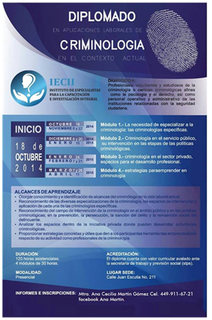 In the curricula of undergraduate, master's and doctoral (Hikal, Perez Tolentino, Romero Muñoz, and Gutierrez Cruz, 2018), the only specific criminologies that are emerging are: Critical Criminology, Criminology Clinic, the curriculum of subjects include by specialized branches of other areas of knowledge, namely: Criminal Psychology, Criminal Sociology, Criminal Statistics, Human Rights Criminology and Criminal Anthropology, Criminal, Constitutional, among others, Criminal Policy, correctional treatment, Victimology, among others. In 2014, the criminologist's degree, Yadira Calixto Contreras, as then, the coordinator's degree in criminology at the University Institute Mexico, in the State of Mexico, took first curriculum with specialized subjects: Criminology Biological, of Human Rights, Psychological, Social, Children and Youth and Women, IT, Comparative, and a specialty area in Victimology: Victimology Criminal (Figure 1). Some other advances have been, in 2014, the Diploma in Criminology industrial applications in the current context where the first module, you start with the theme: The need to specialize to criminology: the specific criminologies. Aguascalientes organized by the Institute for Training Specialists and comprehensive investigation (Figure 2). In 2015, the Supreme Court of Justice of the Nation, through the House Legal Culture of Obregon, Sonora, Specific Days of criminologies were given (Figure 3). In 2018, among the Mexican Society of Criminology chapter Nuevo Leon and the Mexican Federation of Criminology and Criminalistics, launched the first International Diploma in criminologies Specific, divided into the following blocks: multifactorial etiological Criminology, Criminology of social phenomena, preventive Criminology, Criminology forensics, corporate Criminology, Criminology psychological, educational Criminology, Criminology human rights, Children and youth Criminology, Criminology Women, criminology terrorism, environmental criminology, among others (Figure 4).