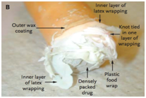Most commonly the heroin trafficked from Pakistan and Afghanistan into the UK will be found to hit the UK in Bradford, the West Midlands and the south of Manchester due to family links and relations.40 One of the most frequently used and most undetectable methods for smuggling is body packing and body stuffing. This is an activity that is low cost for exporters and can be done voluntarily for payment, or in many cases of organized crime, people are forced or threatened to carry out the highly illegal activity. The packets of drugs are either swallowed or inserted into the body cavity. On average a single smuggler, also known as a drug mule, will carry 1Kg of drugs in 50–100packets, containing 8-10g of the illicit substance. This weight contains an excess in the fatal dose required of the substance and therefore carries high risk. The amount carried is dependent on the individual’s capacity limit, as there have been reports of drug mules carrying over 200packets.41 The packages themselves come in forms of capsule shape, with the contents concealed within condoms, latex fingers of gloves, plastic bags and balloons (Figure 7).