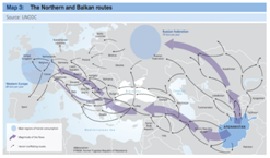 Figure 9 The Northern and Balkan routes used for heroin trafficking from Afghanistan.53