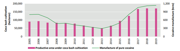 Figure 3 Productive areas under coca bush cultivation and manufacture of cocaine in Colombia, 2005–2019.9