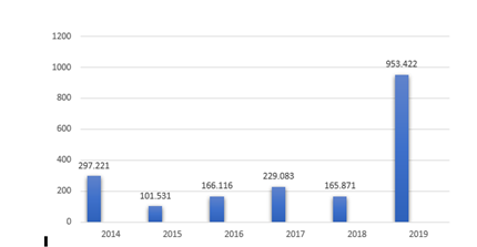 Figure 4 Cocaine confiscations in Kilos, in 2014-2019.30