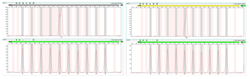 PowerPlex® 21 (heterozygote 9.3/10.1) (lower left); PowerPlex® 24 (heterozygote 10/10.1) (lower right) show different results. Same sample was tested by all three kinds of PowerPlex kits: PowerPlex® Fushion6C, PowerPlex® 21 and PowerPlex® 24. Although, clearly, there is a split peak at this locus, two different heterozygous typing are observed: the first two kits have identical results:9.3/10.1. and the other kit is 10/10.1. Then we applied six other multiplex kits including ACGU® EX25, AppliedBio®HuaXiaBaijin, SureID® PanGlobal, GoldenEyeTM 20a, GoldenEyeTM25a and HuaDa ® YanHuagn to find out the real peak-shape and the right typing of this rare allele (Figure 3).