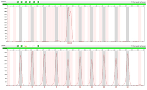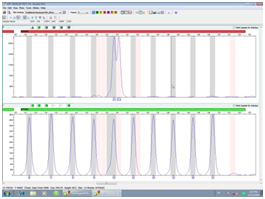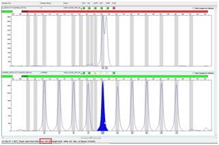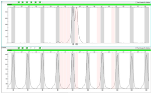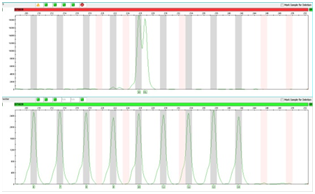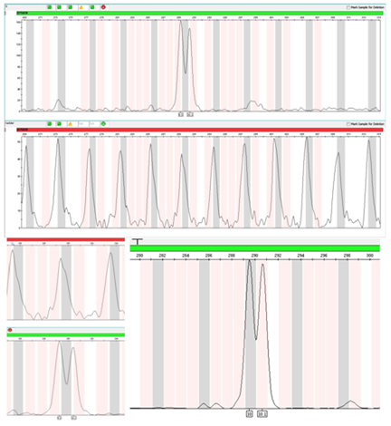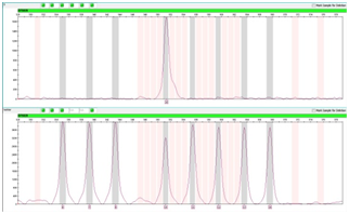 However, even within bin range, results could be inaccurate (Figure 2). This mainly due to the peak deviation. Sometimes, ladders could have little deviation to the left or right from bins, hence, sample peaks from same batch could also have displacement in the same direction. When these peaks near stripe border between bins (gray or pink stripe) and off-ladder area (white stripe), they could be misjudged by GeneMapper software, error occurred. Peak deviation caused by many reasons, apart from experimental errors, one of the most important reasons is that the primer and position design of the locus on the panel was not optimized. Optimization for rare allele can either by adding virtual bins to the flank regions of neighboring loci or put loci with rare alleles within ranging of 75-250 bps in the system panel when designing multiplex primers.11 As we known, the best position for detecting rare alleles is within 75-250bps on the STR multiplex kit’s system panel. This is because the further away from this range, the speed of electrophoresis is getting more unstable, the peaks became wider and lower, and the system perform lesser resolution, especially for rare alleles, therefore, peak deviation appears.