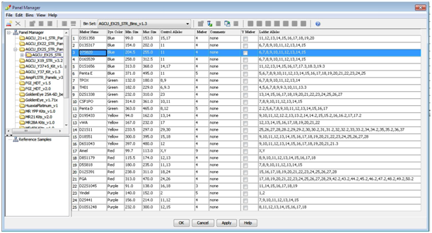 Manually analysis of an off-ladder allele at D7S820 locus with AGCU EX25 (Figure 7) is shown in GeneMapper Software plots (bp size versus relative fluorescence units). To do so, first we should know the repeat number of the certain locus. Let’s take the system panel of AGCU EX25 For example, the repeat base value of D7S820 labeled as ‘marker’ is ‘4’, which can be found in the upper middle ‘panel manager’ tab, marked by blue bar (Figure 6). This value also means microvarient alleles can only include 10.1,10.2 and 10.3. We can also check the label ‘Ladder Alleles’ to the right on the same blue bar of he tab. Allele 10.1 is not in the list, which means we must label this allele manually.