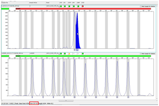 Sometimes, off-ladder allele may fall out of the locus range on system panel Figure 8. Under these circumstances, we should judge which locus the off-ladder allele should belong to at first, by comparing the distances to each locus respectively. Normally, the closer the peak to the certain locus, the more chance it should belong to. Then we can compare the position of the off-ladder peak with the nearest bin with the method described above. In this case, the difference value is 8bps, which means there are 2 repeats between the off-ladder peak and the bin, thus, the off-ladder allele should be labeled as ‘8’. But the most reliable way to get this kind of off-ladder allele typing is to perform ether Sanger or massive parallel sequencing test.