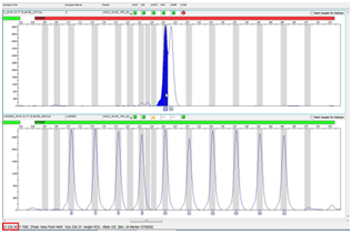 Sample allele was identified by recognition within floating bins (vertical gray stripes) around D7S820 alleles of the AGCU EX25 allelic Ladder Figure 7. One of the alleles that fell outside allelic ladder bins was flagged as ‘OL’ allele is shown. In this example, peak position is compared to the nearest allelic ladder using GeneMapper software. To be specific, as shown in Figures 7A & B, we put the mouse at off-ladder peak ‘OL’ and find the value of the ‘Size’ label in the lower left of the tab shows: 227.25bps. Then we put the mouse at the nearest ladder peak ‘10’, the value is 226.33bps.The apparent size difference relative to the D7S820 allele 10, verified by DNA sequencing as a 1bp insertion, defined a D7S820 10.1 allele. Sometimes, easier way is to use the abscissa value in lower left corner Figure 7C of the tab when pointing at the bin’s peak near the off-ladder peak instead of the ‘Size’ value of the ladder.