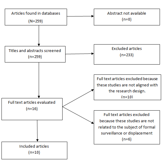 The flow chart in Figure 122 shows that the above terms totaling 259yielded results in the database Web of Science. All these items are then screened by title, with 33 articles as potentially relevant were judged. From these results, the abstracts were examined in order to assess whether the contents of the article, in all probability also met the inclusion criteria. Of these 33 articles were found seven still irrelevant to the question. Of the remaining 26 articles has been the full text. During the assessment of the studies showed there are some articles that did not meet the required design or research studies were no effective formal surveillance of a displacement or diffusion of benefits of crime. These are therefore excluded as well. Eventually, by this method remaining ten studies that will be discussed in this systematic review.