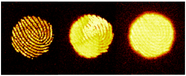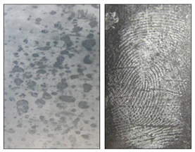 Figure 5 Left image to show a 20-day old finger-mark in Coca-cola contaminant on an external uPVC surface, compared with the right image which shows a finger-mark aged over 1 year, deposited in the oil contaminants from sausage and chips on a glass substrate stored outside and exposed to weather conditions.25