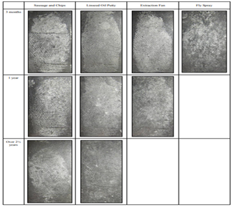 Figure 6 Images of finger-mark persistence of up to and over 2 1/2 years using oil from sausage and chips, linseed oil putty, grease from an extraction fan and fly spray as deposition contaminant.25