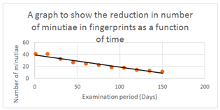 Figure 7 A graphical representation of table 3, showing that a straight-line plot can be produced for the disappearance of minutiae in a finger-mark over 150 days.34