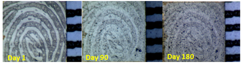 Over 800 fingerprints were used for this study but donors possessed limited variability by undertaking similar daily tasks. It would be more beneficial to obtain donors from all backgrounds to grasp the effects of intervariability factors on a more widespread basis. Microscopic analysis established the shape and location of the pores. It was described that immediately after deposition, the pores were near each other, located either centrally or towards the edges of the ridges. Pores in the centre were well defined and closed, unlike those at the periphery that were open or closed. Further analysis after 5 days determined that the pore shapes had altered, with some opening. It was observed that with ridge degradation, some pores disappeared altogether. Remaining pores appeared to get closer and began joining into chainlike formations. Despite these significant findings, the aging period was only 5 days and therefore cannot provide an accurate representation of how degradation impacts pores over longer, more realistic time periods. If pores disappeared after only 5 days, complete disappearance is possible by analysis time and therefore as an aging parameter they are unrealistic. Additionally, varying deposition conditions could mean that not all pores are transferred across on to the questioned mark or 10 print identification form, potentially leading to confusion when observing corresponding pores. A consistent time period was employed for measurement of ridge thickness and valley width, ensuring that readings were taken every 15 days for 180 days. This larger time period better replicates forensic time frames, providing more reliable data. Different influential factors were considered, storing samples indoors and outdoors to understand the impacts. Table 4 shows the measurements obtained and Figure 7 provides visual representation of ridges and pores changing with time when viewed macroscopically.