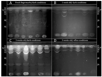 Triglycerides and wax esters were visible in all samples, showing that despite only aging for a maximum of 4 hours, the lipids were lost rapidly. The loss may have been sped up due to the high temperature, but this influential factor requires additional investigation. Organic components have shown to be reasonably stable after deposition but will degrade over time.19 Contaminants are contributory factors in finger-mark residue, understanding how they survive/degrade with time is crucial. Considering blood contaminant, water components evaporate over hours/days, drying out the mark.19 Leaving proteins which persist over years eventually degrading. Contaminants such as grease will generally dry out and display progressive degradation.19 Understanding the capabilities of fingerprint enhancement treatments, visualisation of changes in aging finger-mark residue is possible. Physical Developer is an enhancement process used on porous items like paper, to detect latent finger-marks by forming silver/grey deposits on the ridges.23 The aqueous, silver-based reagent24 relies on the interaction of colloidal silver particulates with the lipids and fatty acid constituents of the sweat residue.23 It is thought that PD targets eccrine constituents trapped within a water-insoluble matrix,19 PD is ideal for enhancements on wet porous items indicating an age of finger-marks and is more successful on older marks. The desired constituents for the reaction persist for much longer than those, like amino acid components, possibly due to a protective layer formed around the lipids and fatty acids of interest when the finger-mark dries out.19