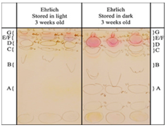 Figure 10 TLC plate showing the use of Erhlich's reagent to visually compare the autofluorescence of finger-marks when stored under different environmental conditions.27