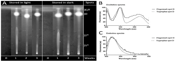 Figure 11 (A) TLC plates showing the aging of tryptophan at 0, 1, 2 and 3 weeks in both light and dark conditions. (B) Excitation spectra of finger-mark spot D and tryptophan spot D aged at 3 weeks. (C) Emission spectra of fluorescent spot D and tryptophan spot.27