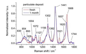 Protein raman bands still visible after 4 weeks of aging. Over time, relative protein contribution in 1600-1700cm-1 band increases unlike others which degrade faster. Oily areas aged over 100 hours showed a slight increase in relative raman intensity at 1630cm-1 regardless of light. |