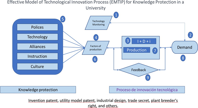 As a result of these findings, we propose the Model for Effective Technological Innovation Process (METIP), which can be adapted for use in any university. The model encompasses the following steps: Step 1: Technological surveillance, which involves collecting, monitoring, and analyzing data and communications from patent databases, scientific article databases, and other knowledge databases to establish and identify the state of the art in a defined technological field. Step 2: Technological demand, which refers to the need or desire for innovative and advanced products or services by consumers and businesses. This demand can be driven by factors such as increased efficiency, improved user experience, enhanced safety, cost reduction, and greater accessibility. Step 3: Research, Development, and Innovation (RDI), an integral process involving scientific research, technological development, and innovation of products, services, or processes. RDI is crucial for the growth and competitiveness of companies and economies as it enables organizations to create new products and services that meet the needs and desires of customers and improve internal processes for greater efficiency and profitability. Additionally, RDI contributes to advancing knowledge and solving problems in various fields. Step 4: Factors of production, which include the tangible and intangible resources necessary for innovative materialization. This encompasses human effort, skills, technical knowledge, risk-taking ability, and decision-making to organize and coordinate other factors of production. Step 5: Knowledge protection, which involves preserving and protecting intellectual property and confidential information, such as patents, trademarks, trade secrets, etc. This may include implementing security measures, signing confidentiality agreements, and applying for patents and trademarks. To achieve this, it is necessary to have policies, technological tools, strategic alliances, instruction and knowledge of intellectual property, and an investigative organizational culture. Step 6: Verification of the resources required to develop the innovative activity. Step 7: Production, which is the stage where the innovative idea is materialized into a technical document. This document specifies the problem, the technical solution and its feasibility, the technological level components or procedures, technical parameters, optimization, claims, and corresponding diagrams. Step 8: Communication with the demand side to validate the expected outcome. This interaction allows for continuous and ongoing improvement. Step 9: The entire system undergoes constant monitoring through a feedback mechanism driven by technological advancements and updates to quality indicators or standards.