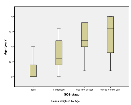 With regards to male subjects, 13 cases had open suture with a mean age of 16±1.53years, twenty cases had semi-closed suture with a mean age of 18.5±2.54years. In the group with semiclosed suture, twenty-five male cases had closed suture with persistent scar their mean age was 21.32±2.21years. Furthermore, sixty-three cases had closed suture without any visible scar. In this group the mean age was 21.78±2.94years. There was a significant difference in SOS stage among different age groups (p<0.000*) (Table 1 & Figure 1).