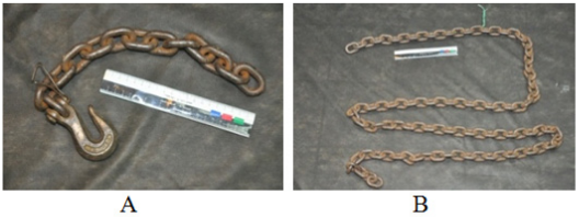 1. Two segments of metal chain with 10mm thick links, from the chain that lashed the cargo to the trailer. One segment was 40cm long with a forged 5/16” 9cm hook (Figure 4a). The second piece was 250cm long and had no lashing fitting on it (Figure 4b).