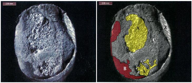 Figure 6 Various areas on the failed link’s fracture surface. Crushed zone (Z), break zone (A), pre-failure rusty zone (B), ductile fracture zone (C).