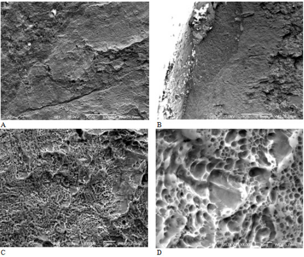 1. Figure 6 zone A shows a planar area with cleavage in the center of the cross-section, compatible with a brittle fracture caused by overload. This area constitutes approximately 20% of the link's cross-section. The chain was quenched during manufacture creating created an area with improved erosion resistance; this means that during overload a fracture would present brittle material properties. Cleavage occurred during the last stage of the link breaking, over a short period of time. The images in Figure 7 were taken in the cleavage area of the open link,6 at various magnifications. It is possible to discern a brittle fracture mechanism in these images, which is typical of overload.