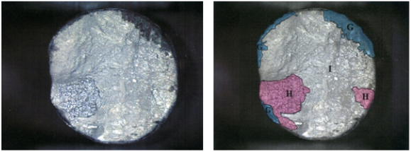 On examining the chain, several more cracked links were found with varying degrees of damage. The link with the largest crack (Figure 10), was tensile tested on an Instron KPX machine. The link collapsed at a 3.8 ton load. Morphology of the fracture surface area on this link, indicated that the link had the same type of zones, although the ratios were different. The most rusted area (Figure 11 zone D) covered close to 70% of the link’s surface; 20% is cleaved (Figure 11 area E), and the remaining area is an overload ductile fracture (Figure 11 area F). To test the chain’s strength, several tensile tests were conducted on links that showed no visual signs of cracks on initial inspection. Yield load was 5.5-6 tons. All the tested links failed at their weld point. Morphological examination of the fracture surface on these links, showed that some of the links were not rusted. Some had the three areas described earlier, with different ratios. The rusted area takes up less than 10% of the cross-section (Figure 12 area G). When examining the results in view of the theory, it is very evident that the highest load that can be placed on a link is proportional to the effective cross-section of that link, excluding the rusted surface area. The disconnected link that directly caused the accident was only rusted over 20% of its cross-section, this was compared to the most rusted link tested (Figures 10&11) in the lab which was rusted over approximately 70% of its cross-section. The conclusion is that the failed link was exposed to additional force to the tensile force. Otherwise, the failed link would have been the most rusted link (Figures 10&11).
