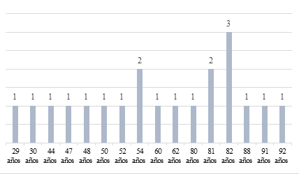 The average age of the people within that item is 64. But there is a particularity, that a little more than 50% of these people are over 60 years old, so it can be stated that within this range Most of the people with disabilities find that they need to carry out some legal act. It is striking that among the users of the notarial service for the formalization of a support agreement there is no population between the ages of 18 and 28. And on the contrary, the majority of users are concentrated in ages over 50 years. Of the twenty cases analyzed, 50% correspond to ladies whose ages range between 50 to 92, and the other 50% to men between 29 to 91 years old. This means, on the one hand, equality in the number of people of both sexes, and on the other, that the male population is likely to require support at a much younger age in relation to women.