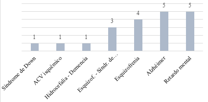 Figure 4 shows the variable called medical diagnosis. It is observed that schizophrenia, Down syndrome, Alzheimer's and mental retardation account for approximately 89% of the total number of people who came to request and obtained the notarial service. This indicator is useful in order to pay greater attention to this population, since it groups the majority of cases. This also explains that the low educational level of this population is in line with such diagnoses.