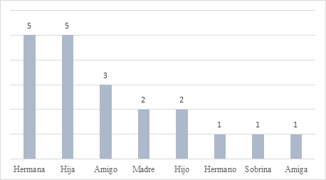 Figure 5 shows the variable related to the relationship or affinity of the support person with the TAJ. It highlights that parental closeness between parents/children/siblings is the call to support PwD. However, it cannot be ignored that in four cases, representing 25%, it was the friends of the TAJ who came out to support them. This means that there is family and social solidarity in this environment.