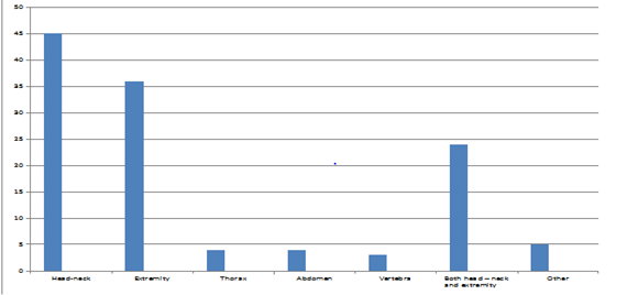 When we split the cases in groups for event types we saw that; 69 cases (57%) were experienced blunt trauma, 40 cases (33%) were experienced traffic accident, 5 cases (4.2%) were experienced penetrating object traumas, 2 cases (1.6%) were experienced wounding by firearms, 5 cases (4.2%) were injured by other causes. When we evaluate the cases by lesion locations; we saw that 45 cases (37.2%) had lesions at head – neck region, 36 cases (29.8%) had lesions at extremities, 4 cases (3.3%) had lesion on thorax, 4 cases (3.3%) had lesion on abdomen, and 3 cases (2.4%) had vertebra injuries. In 24 cases (19.8%) there were legions both at head – neck region and extremities and in 5 cases (4.2%) there were multiple other injuries (Figure 3). When we had analyzed the reports we saw that injuries in 25 cases (20.6%) couldn’t be cured by simple medical intervention, injuries in 8 cases (6.6%) were life threatening, injuries in 6 cases (4.9%) caused permanent scar in face, trauma in 21 cases (17.3%) caused at least one bone fraction and injuries in 8 cases (6.6%) was severe enough to cause function loss.