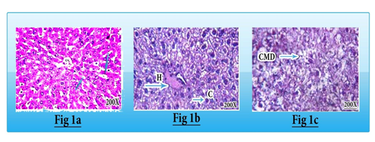 Figure 1 (b) Photomicrograph of cross section of hepatic tissue of group II (acute toxicity) displaying hemorrhage (H) and cytolysis (C), (H&E, X: 200).