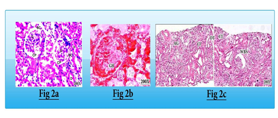 These results were comparable with the findings of Harries et al. (2011) who reported increased ALT, AST activities in rats after acute and long term administration of morphine like agent Levo-alpha- acetylmethadol HCL (LAAM) and also among heroin users and similar to the results of El-Gaafarawi et al.21 who recorded a significant increase in the ALT and AST activities in rats after administration of 40 mg/kg b.wt and 80 mg/kg b.wt tramadol than control ones. Alkaline Phosphatase ALP enzyme present in cell surface in most human tissues. The highest concentrations are found in the intestine, liver, bone, spleen and kidney22 also Moss & Handerson.23 The specific location of the enzyme with both sinusoidal and bile canalicular membranes accounts for the more predominant elevations in certain disorders as observed in the present study with tramadol administration. Impaired secretion of hepatic ALP may be accompanied by acute cell necrosis, so liberation of ALP in the circulation is elevated. The cellular injury may still persist as indicated by increased AST, ALT, ALP and bilirubin activities. The findings of the current investigation were in agreement with those of Sebnem et al.19 who reported that the levels of ALT, AST, ALP and bilirubin were significantly higher in rats exposed to acute and gradual increasing doses of morphine till reaching dependency when compared to the control group. Studying of the histopathological effects of acute and chronic toxicity of tramadol on kidney tissue of group II revealed glomerular hemorrhage, while kidney tissue of group III showed atrophied glomeruli with collapsed tufts, wide Bowman’s space, degenerated tubules and cellular infiltration when compared with control group I.