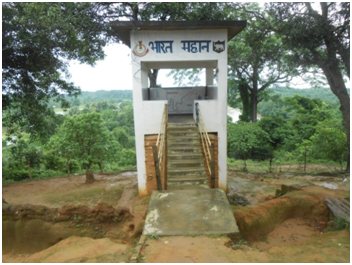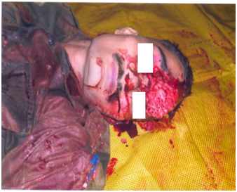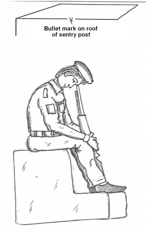 The direction of firing could be of great help in the reconstruction of event in this case. The systematic study of bullet holes (entry/exit wounds) helped to establish the possible position of shooter and direction of firing.3 As per autopsy report, the entry wound was on the back side about 8 cm above the cervical bone and exit wound on the forehead. On close observation of the photograph of entry wound caused by contact firing, it was seen that the wound area was devoid of blackening/tattooing/ charring, also the absence of muzzle impression. As such, the possibility of having entry wound on back side was remote. Further, analysis of the photograph of exit wound (as per autopsy report) it was seen that the bullet injury is devastating and could cause when firing was made at the contact of hard skull. On contact or near contact firing range, the gas/flame produced by the combustion of the propellant could produce fatal injuries more than the injury by bullet. The skull being hard could not expand due to inadequate space for expansion of gas. As a result, large quantities of gas entering into the skull rebounded back and escaped through entry wound pulling out the soft brain matter.4 On spot analysis, it was found that one bullet mark was present on the roof of sentry post at acute angle with respect to the sitting position (cemented platform) of security personal. The position of bullet mark/dead body just after incident was suggestive of the muzzle end of rifle in upward direction (Figures 1–5).
