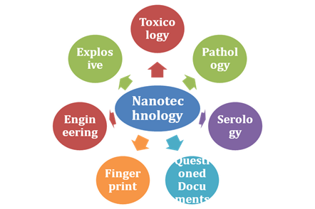 The advent of nanotechnology is taking control of atoms and molecules individually, modifying and placing them to use with an extraordinary degree of accuracy. The word ‘Nano’ comes from Greek word means dwarf, which refers to one billionth (10-9) mean about nanometer (nm). In general, to understand one nanometer is about 3-5 atoms wide or 40,000 times smaller than the width of human hair or a virus that typically 100 nm in size. It deals with emerging material or devices having size equal to 100 nm or lesser. Nanomaterials are applying in different areas including electronics, engineering, physical sciences, materials sciences and also found its application in the field of medical science.1 Its application starts from the production of UV protective sunscreen to advanced drug delivery systems, cancer therapeutics, and nano-based devices. This new paradigm of medical science has been termed as ‘Nanomedicine’.2 Nanotechnology is sometimes referred as a universal purpose technology since in its advanced version it will have substantial impact on almost all industries and all areas of civilization.3 Therefore, degree of expansion of such technology in forensic investigation is plentiful and here, in this paper an attempt was made to discuss the role of nanotechnology with respect to its application in different fields of forensic science, shown in Figure 1.