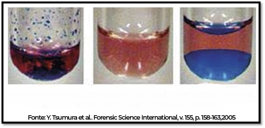 In our country, we use the modified test, using only Ammonium Thiocyanate and Cobalt Chloride which, in an immediate reaction, give the substance studied a cobalt blue color. In cases of positivity, with a blue color identified, the test is presumptive for the substance cocaine.3 Once the pre-test sample is positive, the rest of the material is separated, properly collected and stored; being sent for toxicology examination, as well as blood and fragments of viscera, providing elements for the certainty of the analyzed substance.